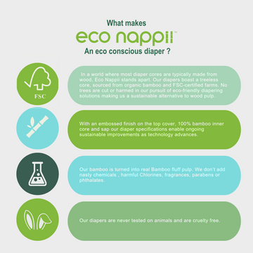 Material Composition: EcoNappii diapers prioritize the environment without compromising on quality. Our diapers are made using renewable and biodegradable materials like bamboo, a preferable alternative to conventional plastics and synthetic materials.