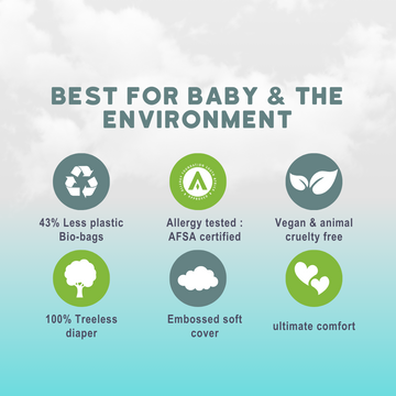 Join us in an eco-conscious parenting journey where your baby thrives and the planet flourishes.Our bags are up to 43% plant based certified by TUV AustriaOur diapers are FREE from :X chlorineX FragrancesX LatexX AlcoholX ParabensX PhthalatesX PreservativesX Dyes and heavy metalsWe use water based inks for our diaper patterns making it sustainable and eco friendly at its highest form.