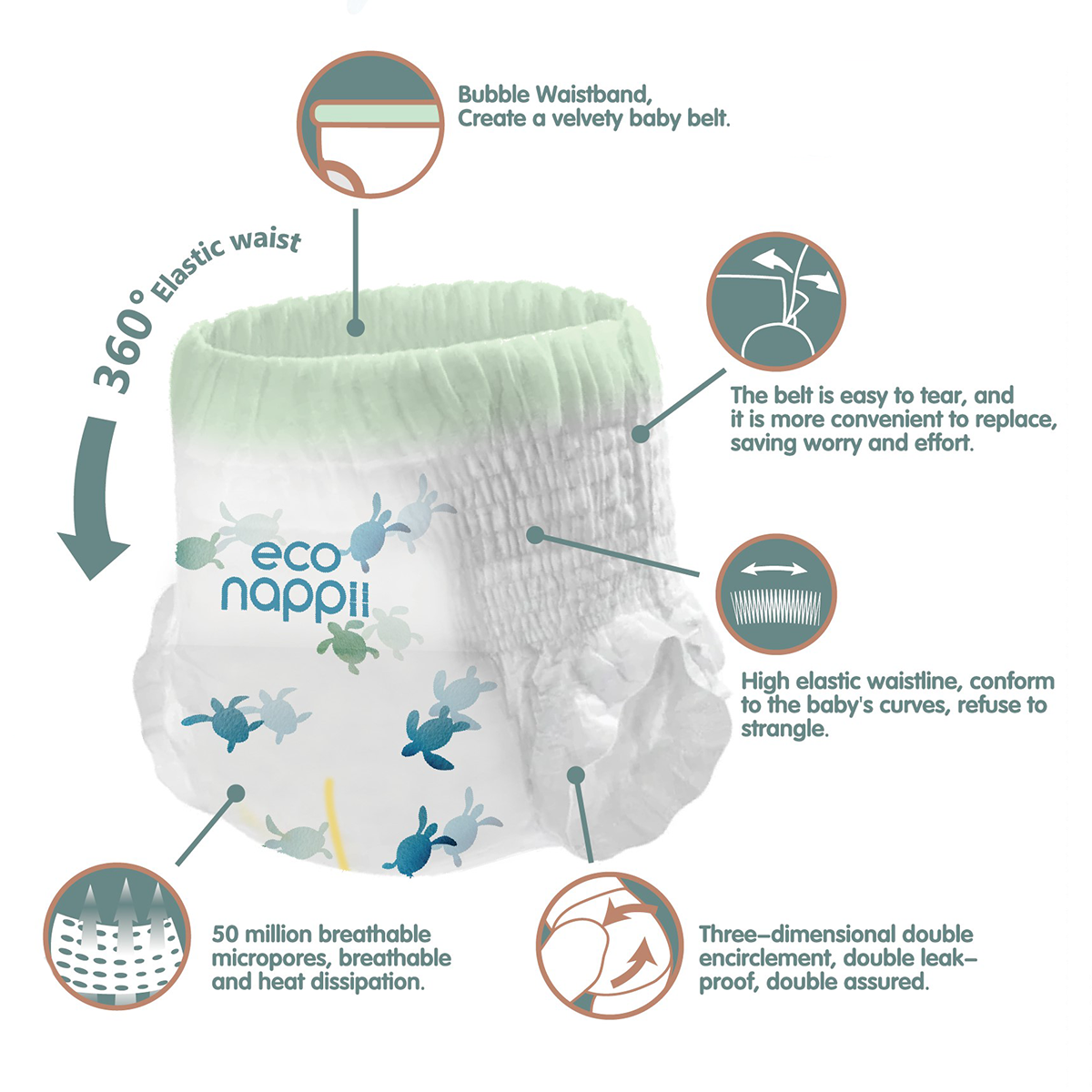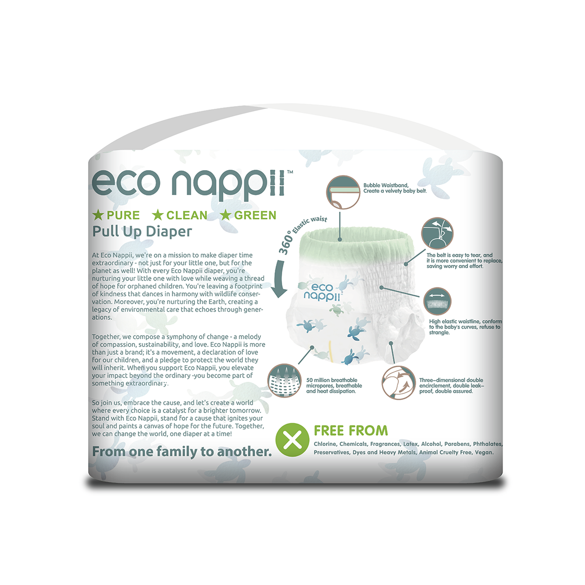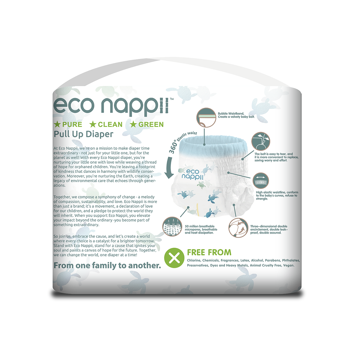 Material Composition: EcoNappii diapers prioritize the environment without compromising on quality. Our diapers are made using renewable and biodegradable materials like bamboo, a preferable alternative to conventional plastics and synthetic materials.