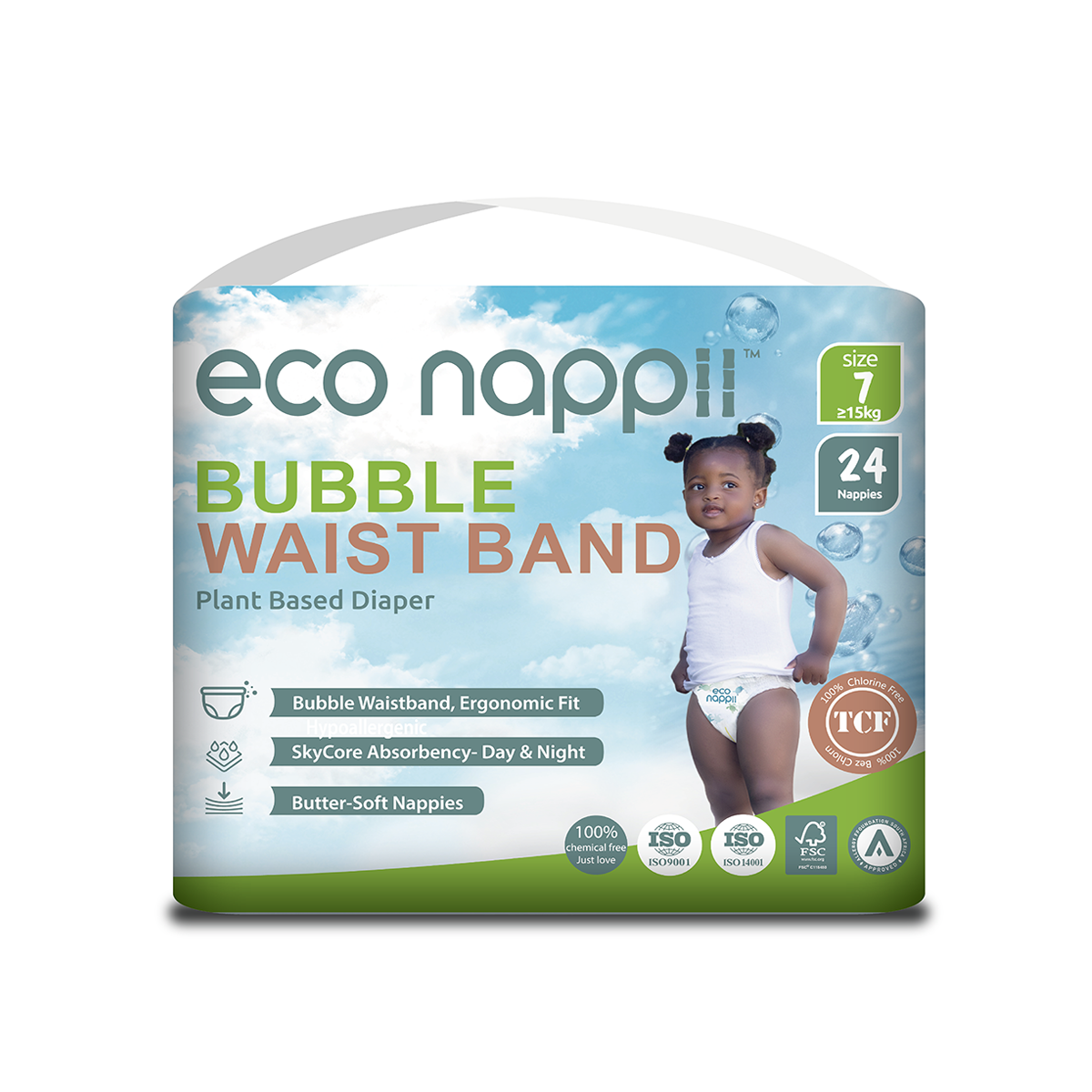 Eco Nappii nappies (sizes 0 – 5) use bamboo pulp for most of a baby’s diapering lifetime, covering the phase where most nappy waste is produced.